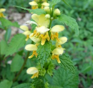 Surnommé Ortie jaune, il n’est pas urticant comme l’ortie. Il pousse dans les haies, bord des chemins. Les feuilles peuvent être panachées de blanc. La fleur zygomorphe a une lèvre supérieure poilue, et inférieure divisée en trois lobes striés d’orangé. Il est en colonie le long des chemins de la forêt de Seillon.